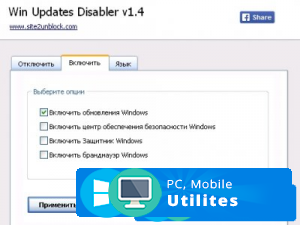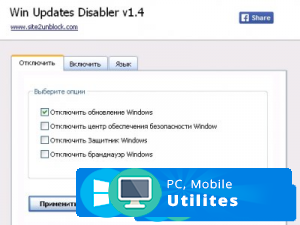Используя удобное приложение Win Updates Disabler, каждый сможет дополнительно подключить либо выключить постоянное обновление ОС Windows. После первого же запуска модуля, перед пользователями появится компактное окно. Чтобы активировать ту или иную опцию, нужно лишь сделать несколько кликов по мыши. Для этого поставьте галочку на любом необходимом для подбора пункте. Но и после предлагается нажать на клавишу «применить». Перезагрузив собственный компьютер, вы заметите, что изменения уже вступили в силу.