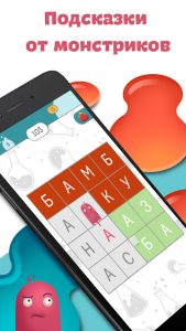 - Прохождение уровня дает преимущество, пользователь получает монстрика, подсказывающего первую букву спрятанного слова;