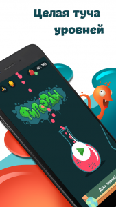 Дизайн игрового поля лаконичный, а вот меню имеет интересное оформление в виде химической лаборатории с колбами, где содержатся цветные реагенты. Наполнение колбы выпускает очередного монстрика.