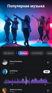 - Можно добавлять музыкальные треки и фотографии к видео;