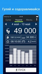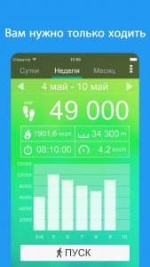 Приложение Шагомер на Андроид позволяет предварительно вычислить необходимое число пройденных шагов, а также рассчитать, общее количество потраченных калорий. Здесь можно вывести наглядную диаграмму по передвижениям за один день, недельку, или даже месяц. Программа простая, легко воспринимается. Пригодится, как профессиональным спортсменам, так и новичкам, которые готовы проследить за своей физической формой.