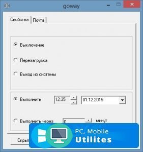 При помощи программы GOWAY можно выполнять выход из системы, осуществлять выключение и перезагрузку компьютера в назначенное время. Ее преимуществом выступает интуитивно понятный интерфейс, а наличие русского языка существенно упрощает настройку параметров. Таймер предполагает использование автоматического режима и размещается на рабочем столе. Утилита имеет дополнительную опцию, что отличает ее от предыдущих версий.